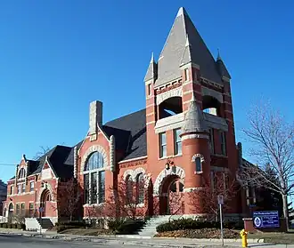 It was designed by Walter A. Holbrook of Milwaukee and built in 1893. The style is Richardsonian-Romanesque, with a complex, irregular profusion of turrets, chimneys and towers resembling Richardson's early libraries, meant to suggest it had been gradually added onto over many years. The exterior is red brick with stone trim. The interior normally seated 500 people, but could be expanded by raising doors to other rooms. A manse and office were added in 1905.[2]