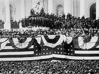 Approximately 250,000 Native Americans lived in the United States when Cleveland took office, a dramatic decline from previous decades.[82] Cleveland viewed Native Americans as wards of the state, saying in his first inaugural address that "[t]his guardianship involves, on our part, efforts for the improvement of their condition and enforcement of their rights."[83] Cleveland encouraged the idea of cultural assimilation, pushing for the passage of the Dawes Act, which provided for distribution of Indian lands to individual members of tribes, rather than having them continued to be held in trust for the tribes by the federal government.[83] While a conference of Native leaders endorsed the act, in practice the majority of Native Americans disapproved of it.[84] Cleveland believed the Dawes Act would lift Native Americans out of poverty and encourage their assimilation into white society, but it ultimately weakened the tribal governments because it allowed individual Indians to sell tribal land and keep the money for themselves.[83] Between 1881 and 1900, the total land held by Native Americans fell from 155 million acres to 77 million acres.[85]