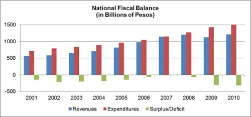 Fiscal policy are "measures employed by governments to stabilize the economy, specifically by manipulating the levels and allocations of taxes and government expenditures".[1] In the Philippines, this is characterized by continuous and increasing levels of debt and budget deficits, though there were improvements in the last few years of the first decade of the 21st century.[2]