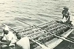 A total of 235 separate stations were surveyed between 22 August 1927 and 19 February 1928, using a wide variety of different fishing gears and techniques.[2] Fish were captured using three different mesh sizes of gill net, as well as trammel nets, a small beam trawl, cast nets, surface and bottom lines, and native basket trawls, papyrus seines ("Ngogo") or fishing weirs ("keks").[2] Other equipment used during the survey included: secchi disc, plankton nets, Nansen's and Apstein's nets, water sample bottles, a Peterson grab, drift-bottles, a Hardy plankton recorder and sounding lines. Environmental parameters measured included: temperature (air and water), depth, pH, water transparency (Secchi depth).[2] Detailed observations were made of local fishing practices and the composition of commercial catches at sites all around the lake. The steam tug SS Kavirondo was chartered from the Kenya and Uganda Railway for the six months in order to deploy fishing gears and provide transportation.[2]