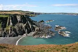 Several smaller inlets pierce the bay's southern shore, whilst in the southwest it has been developed as Fishguard Harbour. The small sandy bay of Pwllgwaelod is located at its eastern extremity. The Pembrokeshire Coast Path, itself a part of the longer Wales Coast Path runs around the bay, taking a slight detour inland along its western side. The majority of the coastline is cliff and rocky shore.[1]