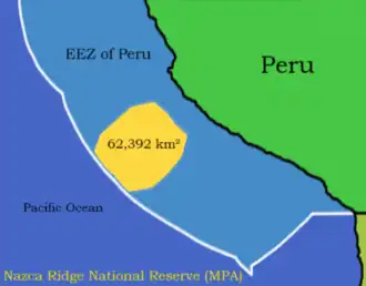 On June 5, 2021, the Peruvian government made a decree that officially established the Nazca Ridge National Reserve MPA, totaling an area of about 62,392 km2 (24,089 square miles).[25][26][27] In Spanish called the Reserva Nacional Dorsal de Nasca,[28] it covers approximately 7.3% of Peru's EEZ.[29] With its establishment, the percentage of Peru's EEZ under protection rose to about 7.8%, nearly 8%.[30] However, the management of the area is under harsh criticism, as it still permits fishing in a direct-use zone to a depth as far as 1,000 meters, with only strict protection from 1,000 to 4,000 meters. Oceana and some 20 other organizations joined together and called the actions of fishing in protected areas illegal, however, Peru's ministry responded claiming that the amount of fishing would be insignificant.[25]