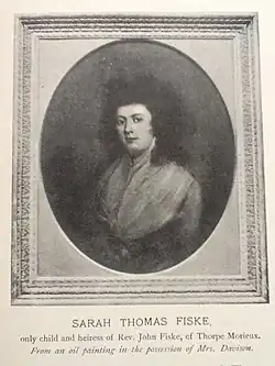 John Haynes Harrison married Sarah Thomas Fiske, only child and heiress of Reverend John Fiske of Thorpe Morieux, Suffolk.[1] The Fiske Family Papers, a history of the family, states that she was heiress to £18,000 on her marriage in 1789.[2]