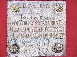 The stone tablet was already installed by Hans Lou in connection with the construction of the building in 1732. Later owner Jørgen Jensen Pinvig added his own initials. A basement entrance is located in the bay furthest to the left. The timber-framed perpendicular wing on Niels Hemmingsens Gade is also constructed with three storeys over a walk-out basement basement but with considerably lower floor heights than the main wing. Its seven-bay facade is crowned by a three-bay wall dormer. The front wing and perpendicular wing are both rendered in a dark red colour towards the street and finished with black-painted timber framing and yellow infills towards the yard. The rear wing is constructed with white-painted timber framing and white infills.[18]