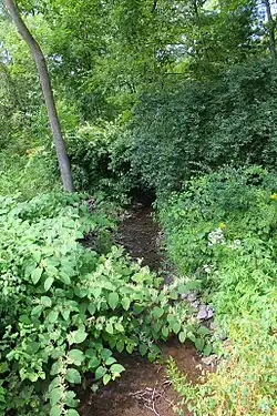 A waterfall known as the Fitch Creek Falls is on Fitch Creek.[7] One reach of the creek flows alongside a road known as Evergreen Road at a distance of approximately 100 feet (30 m).[3]