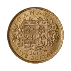 The five-dollar gold piece was a gold Canadian coin that was struck for circulation from 1912 to 1914, consisting of 90% gold and 10% copper.[3]