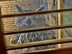 In November 2023, Flaco ventured outside of Central Park for the first time since February. He was seen in a sculpture garden in the East Village neighborhood of Manhattan and, later, on the Lower East Side.[27][28][29] Though his movement may have been triggered by the New York City Marathon or mobbing by crows, November is part of the breeding season for his species and he may have been looking for a mate.[29][30] There are no wild Eurasian eagle-owls in the vicinity, but there are members of a similar species, great horned owls, including one named Geraldine who has frequented Central Park.[30][31] He returned to the park after a week, but made additional forays outside, including several stops outside windows on city buildings.[32] The Wall Street Journal described him as a "peeping tom" after Flaco was recorded multiple times staring through people's windows during this time, including the window of playwright Nan Knighton.[8][33]