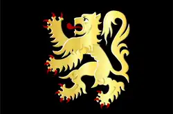 The flag of Flemish Brabant was adopted on January 17, 1995, and was approved on April 16, 1996. It consists of a yellow lion with a red tongue and claws (Leo Belgicus) on a black field. The flag is displayed on all official buildings of the province. The lion is based on the Brabantian lion of the Duchy of Brabant, as well as the colors of the Belgian flag.[3]
