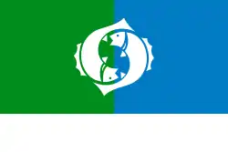 The flag of Khanty-Mansi Autonomous Okrug[a], in the Russian Federation, is a rectangular field arranged with two strips at even proportions (azure on top, and green on bottom). A vertical white strip is attached to the fly side of the flag. A stylized crown at the upper hoist side is charged on the azure strip.