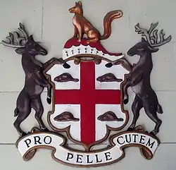 The colours and symbols of the flag carry cultural, political, and regional meanings. According to Auguste Vachon, the bison evokes the Indigenous peoples living in the province, such as the Assiniboine and the Cree. Bison was an integral part of their livelihood, serving as a source of food and clothing. The Cross of Saint George alludes to the patron saint of England, as well as to the arms of the Hudson's Bay Company (HBC), which ruled over the land that is now Manitoba.[32] The Red Ensign is a conspicuous symbol of Great Britain, Canada's mother country.[4]