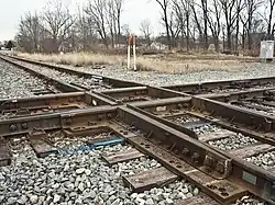 Full flange-bearing diamond frogs are also used in diamond crossings. These frogs are flange-bearing for both lines through the diamond. Because both lines are flange-bearing, there is no need to elevate the flanges of vehicles using one line, as there is in the case of OWLS diamond frogs, which allows for greater gauge restraint. Consequently, vehicles can cross these frogs at the maximum speed allowed by the track design; regardless of which line on which they cross the diamond. Though there are very few of these in use today, full flange-bearing diamonds can be found where two high-speed or high-tonnage main lines must cross one another at-grade.[4][5]