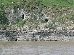 There are argentiferous (i.e. silver-bearing) galena deposits on Flat Holm; the pits and mounds visible on the surface of the island are a result of trial borings. A dispute over lead mining rights in the 1780s ended with John Stuart, Lord Mount Stuart making an official complaint that the lighthouse keeper was using the coals intended for the lighthouse for processing lead.[9] Mining for lead was not profitable, however, and the works were abandoned.[10] Red marl from the Triassic Period fills joints in the Carboniferous Limestone showing evidence of karstic (cave forming) processes during this period. Caves on the western and north-eastern sides of the island were used during the years of smuggling.[11]