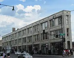 The Flat Iron Building is located in the Wicker Park district of West Town, Chicago, Illinois.[1] The building is located at the intersection of Milwaukee Avenue, North Avenue, and Damen Avenue. Since the 1980s, it has served as an artists colony, and features visual artists and musicians of all disciplines.