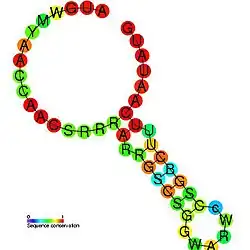 The Flavivirus capsid hairpin cHP is a conserved RNA hairpin structure identified within the capsid coding region of several flavivirus genomes. These positive strand RNA genomes are translated as a single polypeptide and subsequently cleaved into constituent proteins, the first of which is the capsid protein. The cHP hairpin is located within the capsid coding region between two AUG start codons. The cHP cis element has been shown to direct translation start from the suboptimal first start codon.[1] The ability of cHP to direct initiation from the first start codon is proportional to its thermodynamic stability, is position dependent, and is sequence independent. It has been demonstrated that both AUGs and the conserved cHP are necessary for efficient viral replication in human and mosquito cells.[1]
