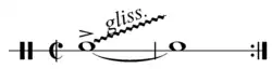 The flexatone is notated using tremolo lines (rolls) to indicate shaking the instrument and lines to indicate the desired direction of the glissando or a wavy line (chevron) to indicate alternating thumb pressure. If using the instrument with the balls removed, indicate strikes with single notes followed by arrows indicating the direction of the glissando (similar to a guitar tab pitch bend). It is recommended that pitch designation should only be approximate,[3] as, "specific pitches are difficult but possible; glissandi without specific pitch are easily executed."[1]