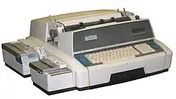 The 2300 series were cosmetically similar to the 2200 series, although without the function keys or numeric keypad, with a simplified plugboard, and operating at 145 words per minute (12 characters per second).[14] In addition to the basic 2301, the 2302 supported the auxiliary tape readers and punches from the 2200 family. The 2304 offered proportional spacing and a carbon ribbon mechanism, making it suitable for preparing camera-ready copy.[15] The base price for the 2300 family was £1400 (British pounds).[16]