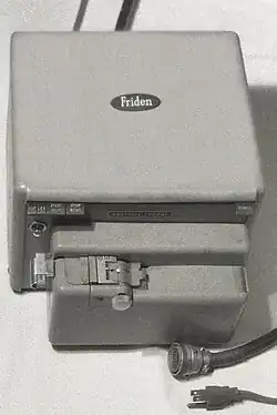 The Friden Flexowriter was a teleprinter produced by the Friden Calculating Machine Company. It was a heavy-duty electric typewriter capable of being driven not only by a human typing, but also automatically by several methods, including direct attachment to a computer and by use of paper tape.