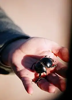 The flightless dung beetle (Circellium bacchus) is a species of dung beetle endemic to a few areas of South Africa, including the Addo Elephant National Park, Amakhala Game Reserve and the Buffalo Valley Game Farm.[1] It is the only species in the genus Circellium.[2] The loss of flight allows the beetle to use the empty space below the elytra as a carbon dioxide storage tank, creating a unique breathing mechanism which conserves water, a valuable survival trait in the arid regions it lives in.[2][3][4]