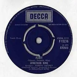 "Flirt!" is a song and single written by Jonathan King, Michel Delpech and Roland Vincent and performed by King.[1] Released in 1972 it reached 22, on the UK charts, staying there for nine weeks.[2][1] The song is a cover of a French song, Pour un Flirt, by Delpech and Vincent, to which King added English lyrics.[3]