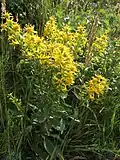 The plants most frequently found in heaths or sub-alpine grasslands, particularly those in the Cantal and Monts Dore, are a certain type of grass[2] (Nardus stricta, Festuca rubra, Poa alpina, Phleum alpinum, Helictotrichon versicolor, etc.) but also, in less grazed areas, shrubby plants (Myrtille, Western blueberry, Hairy greenweed, etc.). They are accompanied by plants characteristic of mountain pastures, such as Alpine clover (Trifolium alpinum), Alpine plantain (Plantago alpina), Great masterwort (Astrantia major), Victory onion (Allium victorialis), Masterwort (Peucedanum ostruthium), Dyer's plumeless saw-wort (Serratula tinctoria subsp. macrocephala), etc. Other species found in wetter areas (megaphorbs) include Rumex alpinus, Cicerbita alpina, Cicerbita plumieri and Adenostyles alliariae. The Lapland Willow can also be found here, sometimes hybridized with other willows (such as the Creeping Willow or the Bicolored Willow).
