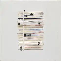 Since 2010, Froehlich has worked very regularly with the ACHTZIG Gallery for Contemporary Fine Art in Berlin.[16] The ACHTZIG Gallery staged a solo exhibition of Froehlich's work in December 2013, entitled "World Theatre-Theatre World". At his occasion a book with his same title has been published by Editions Le Renard par la Queue,[17] Lausanne, directed by the author Ferenc Rákóczy in a contemporary design by Chloé Donzé and contributions by the journalist José Ribeaud. Currently, Froehlich's work is focusing on the human being and the interaction between individual and crowds.[18] Froehlich creates a kind of virtual human microcosmos notably by micro-sculptures integrated in painting-sculptures and sculpture-paintings. In fall 2013, Froehlich had the novel idea to suggest the scenic integration of microsculptures in watches. This idea was officially presented to Swiss watchmakers,[19] with the support of Pascal Bourquard and BIWI.