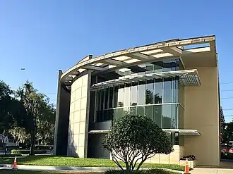 The E.T. Roux library, typically referred to as simply the "Roux Library," is located on the campus of Florida Southern College in Lakeland, FL.[33] Designed by Frank Lloyd Wright for his Child of the Sun campus, the original Roux Library was built between the years of 1941–1945 at the cost of $120,000.[34] The building is circular and housed a multi-tiered reading room in addition to library stacks. In March 1968, the new Roux Library opened in a different location on campus. The new location was designed by Nils Schweizer in a mid-century modern style. Schweitzer was a protege of Frank Lloyd Wright and went on to have a successful architectural career in the state of Florida.[35]