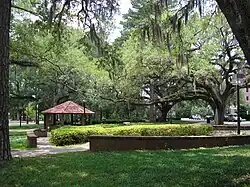 The state acquired the land of the main campus from the City of Tallahassee in January 1857 when the Florida Institute was transferred.[97][32] The main campus consists of 485.87 acres (2.0 km2).[97] Outside Leon County the university owns more than 1,715 acres (6.94 km2).[98] The main campus is bordered by Stadium Drive to the west, Tennessee Street (U.S. Route 90) to the north, Macomb Street to the east, and Gaines Street to the south.[99] The Westcott Building is the school's readily identifiable structure at College Avenue and S. Copeland Street.[100] The Westcott location is the oldest continuously used site of higher education in Florida and is the home of Ruby Diamond Concert Hall which serves as the university's primary performance venue.[101][102][103]