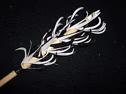 Flu-flu arrows have a distinctive design of fletching, normally made by using long sections of feathers; in most cases six or more sections are used, rather than the traditional three. Alternatively, two long feathers can be spiraled around the end of the arrow shaft. In either case, the excessive fletching serves to generate more drag and slow the arrow down rapidly after a short distance of about 30 m (98 ft). Recreational flu-flus usually have rubber points to add weight and keep the flight slower.