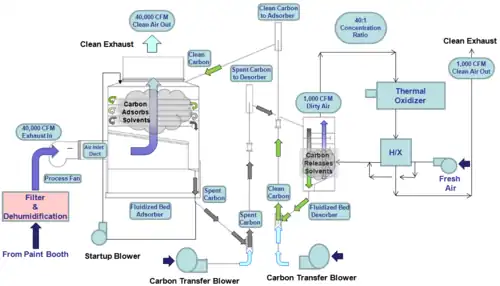 Industrial processes requiring ventilation, including paint booths,[2] printing, and chemical production, exhaust the ventilated air to the fluidized bed concentrator at room temperature.[3] The air first passes into the adsorption tower, where it moves through six perforated trays of clean carbon beads. The 0.7 mm bead activated carbon (BAC) fluidizes in the trays and captures the VOCs as they intermix.