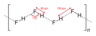 HF is diatomic in the gas-phase. As a liquid, HF forms relatively strong hydrogen bonds, hence its relatively high boiling point. Solid HF consists of zig-zag chains of HF molecules. The HF molecules, with a short covalent H–F bond of 95 pm length, are linked to neighboring molecules by intermolecular H–F distances of 155 pm.[4] Liquid HF also consists of chains of HF molecules, but the chains are shorter, consisting on average of only five or six molecules.[5]