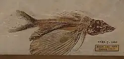 The oldest known fossil of a flying or gliding fish are those of the extinct family Thoracopteridae, dating back to the Middle Triassic, 235–242 million years ago.[28] However, they are thought to be basal neopterygians and are not related to modern flying fish, with the wing-like pectoral fins being convergently evolved in both lineages.[29] Similarly, the Cheirothricidae of the Late Cretaceous also similarly evolved wing-like pectoral fins that were likely also used for gliding, but are indeterminate eurypterygians; they are possibly Aulopiformes, which would make them most closely related to lizardfish.[30]