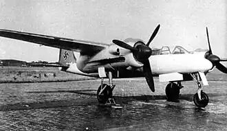 On 1 July 1943, the prototype Ta 154 V1, which was outfitted with Jumo 211F engines and bore the Stammkennzeichen identification code TE+FE, performed its maiden flight in the hands of Kurt Tank.[6] It was followed by V2 with Jumo 211N engines, which was kept at the factory for handling trials. V1 was later dispatched to Rechlin-Lärz Airfield to conduct fly-off testing against the competing He 219A as well as the new Junkers Ju 388. Reportedly, the aircraft reached almost 700 km/h (440 mph) and easily outflew the other two aircraft, but those were both fully armed and equipped with radar apparatus. In comparison, neither V1 or V2 were fitted with radar at this stage.[6]