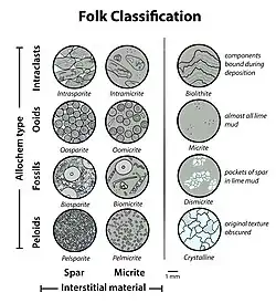Folk's carbonate rock classification details the relative proportions of allochems in the rock and the type of matrix. The classification scheme covers most common carbonate rocks, however the more inclusive although less precise alternative, Dunham classification, may be preferred in some instances. Folk classification consists of one or two prefixes followed by a suffix.[1]