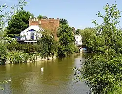 A toll-booth gateway tower used to straddle the approach to the bridge, which was on the Abingdon to Banbury turnpike. The former bridge and "Bacon's Tower" were drawn by many artists, including the twelve-year-old J. M. W. Turner.[7]
