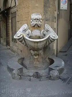 The fountain, located at the acute angle (sprone) formed by the intersection of the two streets, nestled against the private building, was traditionally supposed as designed and sculpted by Bernardo Buontalenti, who would have completed it in 1608, likely for the celebration of the wedding of Cosimo II de' Medici and Maria Maddalena d'Austria.[1] Anyway, more recent studies discovered that it was sculpred by Francesco Generini in 1638-1639, at the end of the construction of a water conductured for ferdinando II de' Medici.[2]