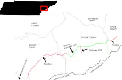 | Sevier | Wears Valley | 33.0 | 53.1 | Western segment northern terminus | |