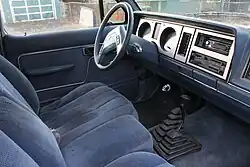 For 1989, the Ranger underwent a mid-cycle redesign with new front fenders, a restyled hood and grille, and flush-mounted composite headlamps (with larger marker lamps). To further improve aerodynamics, the front bumper was redesigned and enlarged to fit more closely with the front fenders.[18][7] Badging was revised; the fender icons were restyled, and the "FORD" lettering on the right-hand side of the XLT-significant tailgate trim panel was switched for a blue oval. The interior was given a redesign, including new door panels, new seats, and an all-new dashboard (introducing a glovebox).[18][7] To improve ergonomics, the instrument panel was redesigned for improved legibility, with automatic transmission Rangers receiving a column-mounted gearshift; manual-transmission versions saw the removal of the key-release button from the steering column.