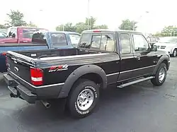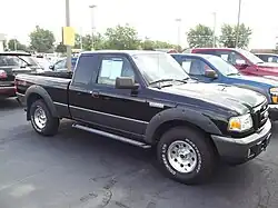 Slightly larger than the Courier, the first-generation Ranger was approximately 18 inches shorter and 11 inches narrower than an equivalently configured F-100/F-150.[5] While proportioned similar to the Chevrolet S-10 and Japanese-sourced compact trucks, it adopted exterior design elements from the F-Series, including its twin headlamps, chrome grille, "FORD" tailgate lettering, tail-lamps, and cab proportions.[18] In line with the Courier, the Ranger was offered with two pickup bed sizes; a standard 6-foot length and an extended 7-foot length. In 1986, a third configuration was introduced with the advent of the Ranger SuperCab. Extended 17 inches behind the front doors for additional cab space, the SuperCab was offered with the 6-foot bed length; four-wheel-drive SuperCabs were sold only with V6 engines.[18]