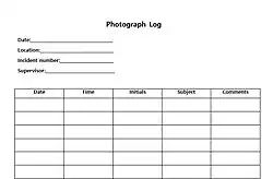 The responding officer must also maintain a photo log if any photographic documentation is taken. The log should contain the date and time of the photograph, the subject matter, and any additional notes. These logs must be maintained within a case file or incident report, as they are a part of the examination record and discoverable material at trial.[7]