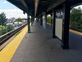 The Forest Avenue station is a station on the BMT Myrtle Avenue Line of the New York City Subway. Located on a private right-of-way in Ridgewood, Queens, the station is served by the M train at all times. The station opened in 1915 as part of the Dual Contracts.