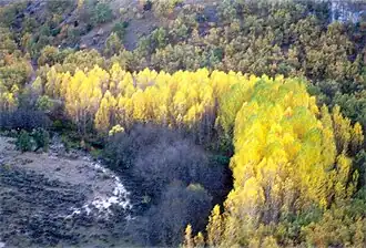 Los quejigares of Portuguese oaks (Quercus faginea subsp faginea) are the most typical and common of the peninsula, since they are found from the Serranía de Ronda in Andalusia to the lower slopes of the Pyrenees. They are much more resistant to the cold and damp than Q. canariensis; on the other hand, they need cooler and deeper soils than the Holm oaks with which they come into contact. Although they can grow in any type of soil, in siliceous soils the usually play a secondary part with respect to Holm oaks, cork oaks, and Pyrenean oaks; it is only on chalky soils that it forms forests of any consideration, especially in the northeast quadrant and centre of the Peninsula. The natural area corresponding to the quejigo is frequently the black pine (Pinus nigra subsp salzmannii), which often has been extended at its expense.