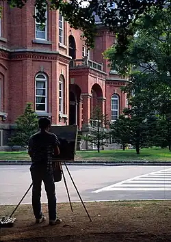 The measurement of the building is 61 metres in frontage, 36 metres in depth, and 33 metres in height to the top of the tower.[1] The red bricks used in the wall of the building were made in Toyohira and Shiroishi villages, which are currently wards of Sapporo (as Toyohira-ku and Shiroishi-ku), and the number of the bricks in the walls is around 2.5 million.[1] There are 20 paintings inside of the building, which depict historically important scenes in the history of Hokkaidō. Most of the windows are double-paned, to keep out the freezing climate of Sapporo.