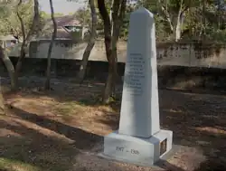 The US War Department approved construction of the rifle range on January 21, 1918 for small arms training of soldiers. After World War II, it was declared surplus and sold, and over the years left untended, the range walls were undermined due to tree roots and water infiltration. Of special concern were the load-bearing supports across interior doorways which were cracking and separating from the walls. In 2012, work started on restoring the range, which involved among other things using contracted labor and volunteers to initially stabilize the walls. Currently, Friends of Fort Caswell Rifle Range, a non-profit formed in 2015, is carrying on this task with the full support of the Town of Caswell Beach and the Caswell Dunes Homeowners Association.[4] On April 5, 2018, the U.S. World War I Centennial Commission and the Pritzker Military Museum and Library announced that the 1918 Fort Caswell Rifle Range was one of the one hundred WWI memorials chosen for a restoration grant and honored with the official national designation as "WWI Centennial Memorial".[5] And then on November 11, 2018, the 100th Anniversary of the WWI Armistice Day, the Brunswick County WWI Monument recently erected on site, was dedicated to commemorate the veterans who fought in the war.[6] In addition to managing the facility, in 2020 the Friends of Fort Caswell Rifle Range arranged to publish Brunswick County in the Great War[7] Containing biographic sketches of all known Brunswick County NC WWI service members, the book features a 25 page introductory section with photos and diagrams along with text about the Caswell Beach rifle pits that chronicles its history.