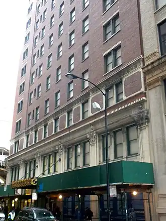 The Fort Dearborn Hotel is a skyscraper and former hotel located at 401 S. Lasalle St. in the Loop community area of Chicago, Illinois. The 17-story hotel was designed by Holabird & Roche and finished in 1914. Designed in the Venetian Renaissance style, the hotel was built with gray and reddish brown brick and featured terra cotta ornamentation. The lobby features two murals by local artist Edgar Cameron depicting scenes of Fort Dearborn. The hotel was built to serve businessmen during a period of extensive hotel construction in Chicago; its site was chosen for its access to transportation, as it was located near LaSalle Street Station and the LaSalle/Van Buren 'L' station. The Hotel Sherman Co. owned both the Fort Dearborn Hotel and the nearby Hotel Sherman, and the two hotels had a common management and kitchen staff. However, while the Hotel Sherman was a typical luxury hotel of the era, the Fort Dearborn Hotel focused on providing practical amenities at lower rates and set an example as a "popular, commercial hotel".[2] The hotel is now an office building known as the LaSalle Atrium Building.[3]