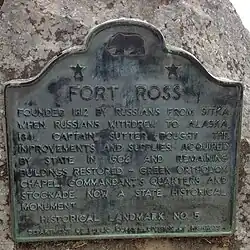 Fort Ross (Russian: Форт-Росс, romanizedFort-Ross, крепость Росс, krepost' Ross, Kashaya: Metini) is a former Russian establishment on the west coast of North America in what is now Sonoma County, California. Owned and operated by the Russian-American Company, it was the hub of the southernmost Russian settlements in North America from 1812 to 1841. Notably cosmopolitan, different ethnic groups settled in and around the fort: Native Californians, Native Alaskans, Russians, Finns, Swedes, making it the first multi-ethnic community in northern California.[4] It has been the subject of archaeological investigation and is a California Historical Landmark, a National Historic Landmark, and on the National Register of Historic Places. It is part of California's Fort Ross State Historic Park.