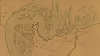 The fortress of Humaitá was situated on a level cliff about 30 feet (10 metres) above the river, on a sharp horseshoe bend.[58] The bend, called the Vuelta de Humaitá[59] was an ideal strategic pinch point. It was some 1,500 metres (4,900 ft) long; the navigable channel narrowed to only 200 metres (660 ft) broad; the current was 2.8 knots (5.2 km/h; 3.2 mph) and in places 3 knots (5.6 km/h; 3.5 mph), difficult for the ships of the day to stem; and (a matter that was to horrify the Brazilian navy[60]) ideal for the release of 'torpedoes' (nineteenth century floating naval mines).[61][62]