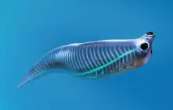 Fossils of chordates, the phylum to which humans belong, are very rare in Cambrian sediments. Conway Morris classified the Burgess Shale fossil Pikaia as a chordate because it had a rudimentary notochord, the rod of cartilage that evolved into the backbone of vertebrates.[63] Doubts have been raised about this, because most of the important features are not quite like those of chordates: it has repeated blocks of muscle along its sides but they are not chevron-shaped; there is no clear evidence of anything like gills; and its throat appears to be in the upper part of its body rather than the lower.[64] It also has "tentacles" on the front of its head, unlike living chordates.[65] At best it may be a stem group chordate, in other words an evolutionary "aunt" of living chordates.[64] Metaspriggina, also found in the Burgess Shale but even rarer, may be a chordate, if the repeated chevron-shaped structures along its sides represent muscle blocks.[63] While Pikaia was celebrated in the mid-1970s as the earliest known chordate,[66] three jawless fish have since been found among the Chengjiang fossils, which are about 17 million years older than the Burgess Shale.[63]