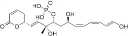 Fostriecin is a type I polyketide synthase (PKS) derived natural product, originally isolated from the soil bacterium Streptomyces pulveraceus.[1] It belongs to a class of natural products which characteristically contain a phosphate ester, an α,β-unsaturated lactam and a conjugated linear diene or triene chain produced by Streptomyces. This class includes structurally related compounds cytostatin and phoslactomycin.[2][3][4] Fostriecin is a known potent and selective inhibitor of protein serine/threonine phosphatases, as well as DNA topoisomerase II.[5][2][6][7] Due to its activity against protein phosphatases PP2A and PP4 (IC50 1.5nM and 3.0nM, respectively) which play a vital role in cell growth, cell division, and signal transduction, fostriecin was looked into for its antitumor activity in vivo and showed in vitro activity against leukemia, lung cancer, breast cancer, and ovarian cancer.[2][6][8][9] This activity is thought to be due to PP2A's assumed role in regulating apoptosis of cells by activating cytotoxic T-lymphocytes and natural killer cells involved in tumor surveillance, along with human immunodeficiency virus-1 (HIV-1) transcription and replication.[10][11][12][13]