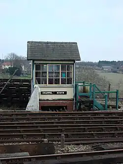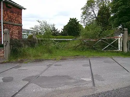The halt was demolished by British Rail long before final closure of the line in December 1980 and little remains of it today.[13][14] The crossing keeper's cottage survives in good condition as a private residence, but the original windows have given way to upvc replacements.[7] The rails remain embedded in the tarmac over Peppin Lane and an old signal stands over the trackbed to the south towards Louth.[7] The gate box was moved to Chappel and Wakes Colne railway station in 1985 as part of the East Anglian Railway Museum.[10]