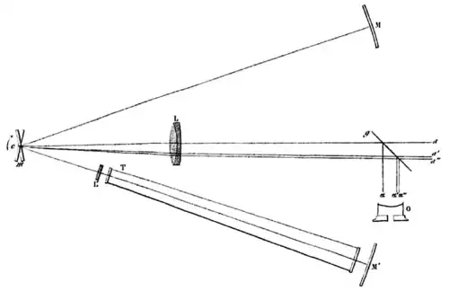 Two radiating points placed one near the other and on the same vertical, shine instantly in front of a rotating mirror. The rays from the upper point reach this mirror only by passing through a tube filled with water; the rays of the second point reach the reflective surface having encountered in their course no medium other than air... [S]uppose that the mirror, seen from the place occupied by the observer, turns right to left. Well! if the emission theory is true, if the light is matter, the highest point will seem to the left of the lower point; he will appear on his right, on the contrary, if the light results from the vibrations of an ethereal medium.